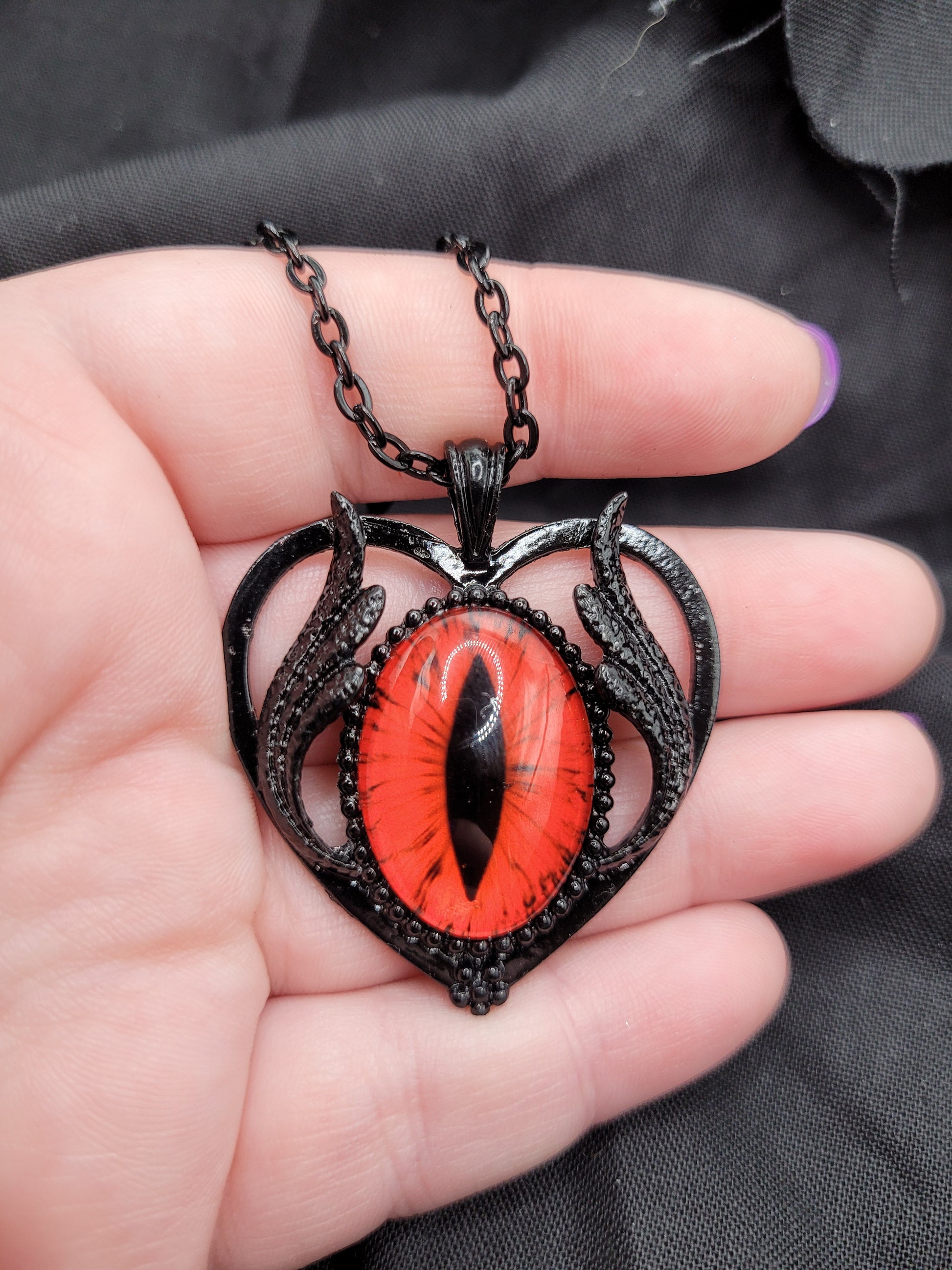 Black and Green or Red Dragon Eye Eyeball RPG DnD TTRPG Gamer Pendant with Black Winged Heart Frame