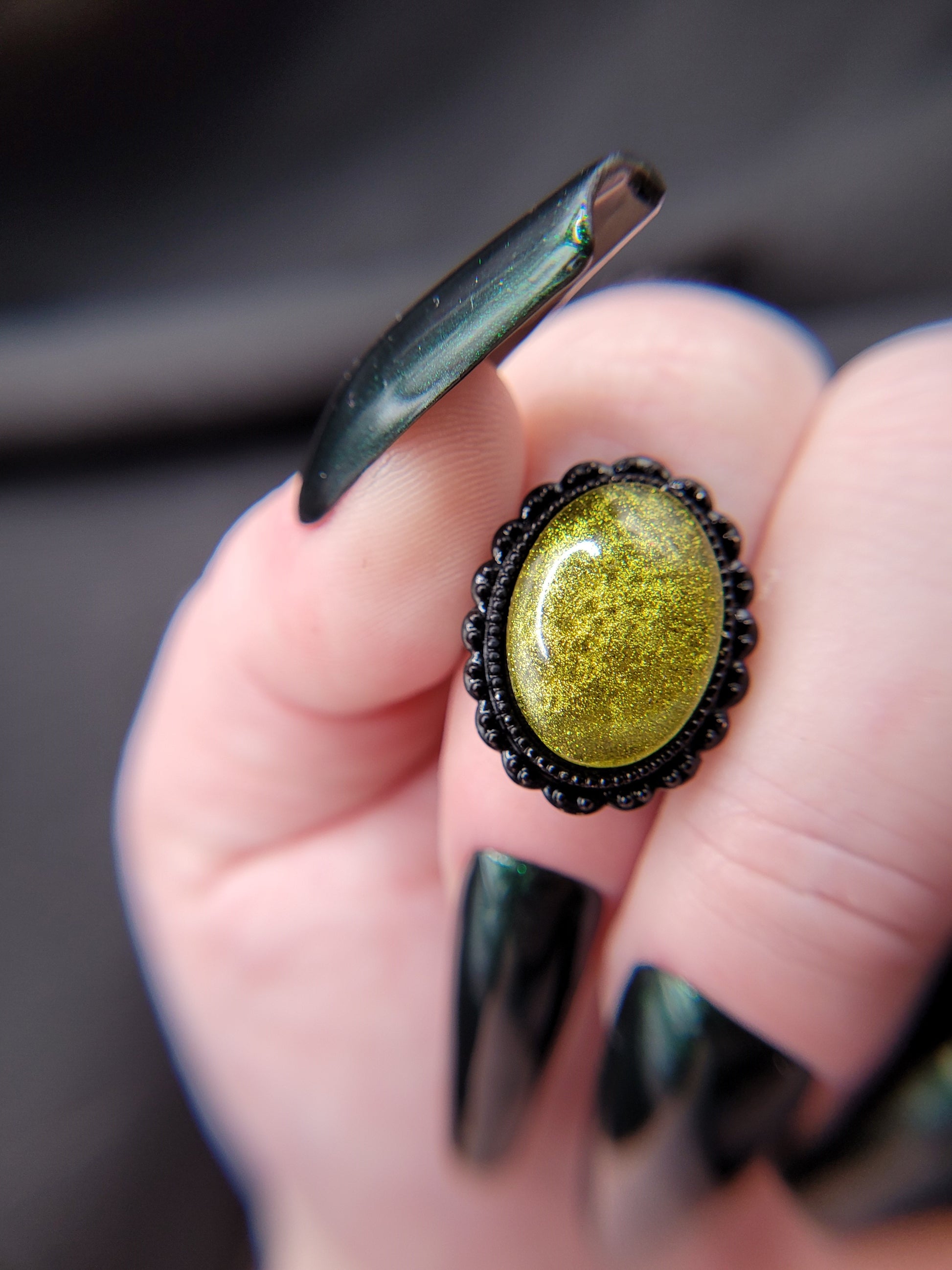 Black and Green Sparkle Resin Ring on Adjustable Black Band