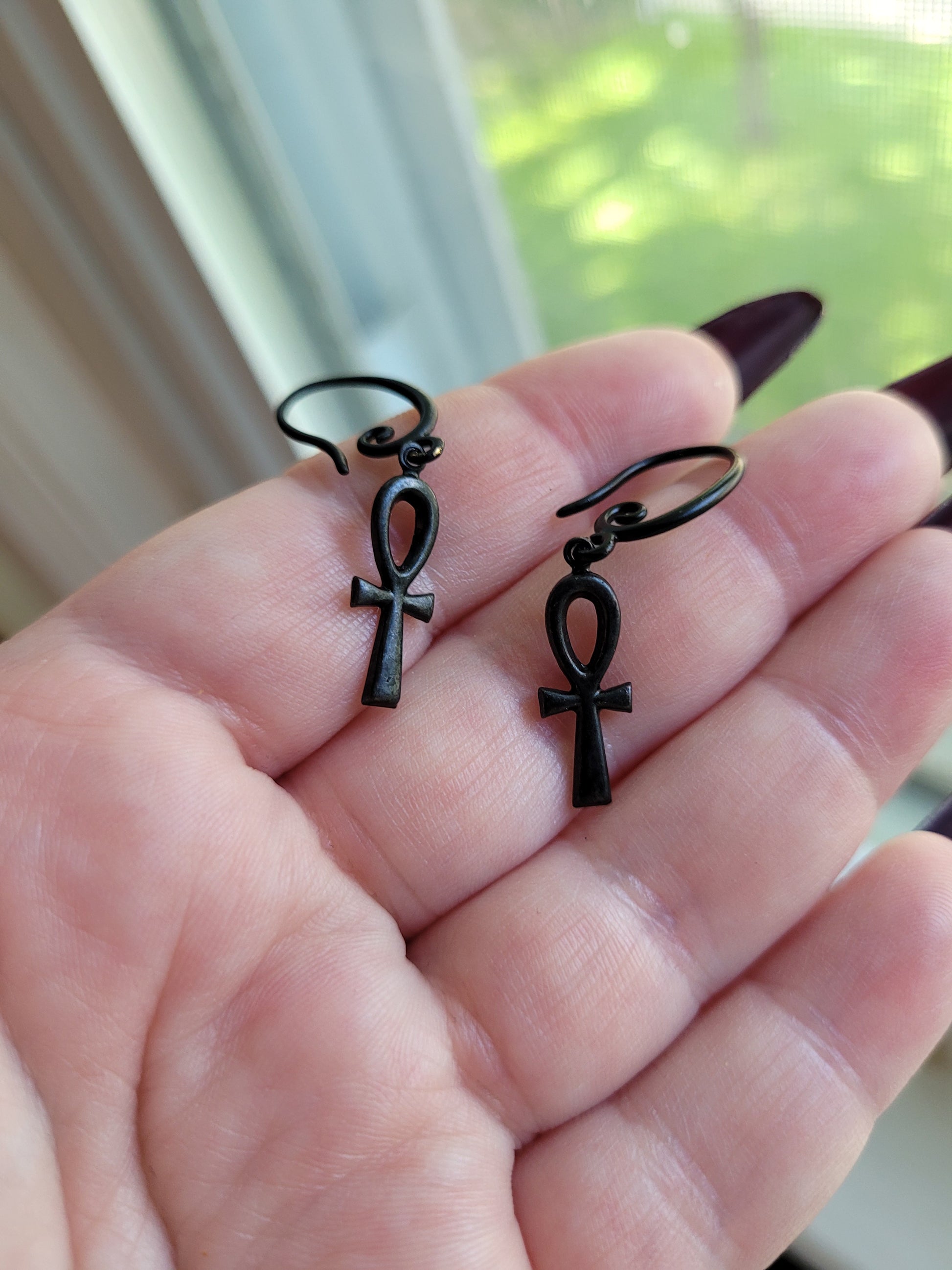 Delicate Goth Small Matte Black Ankh Spiral Swirl Earrings