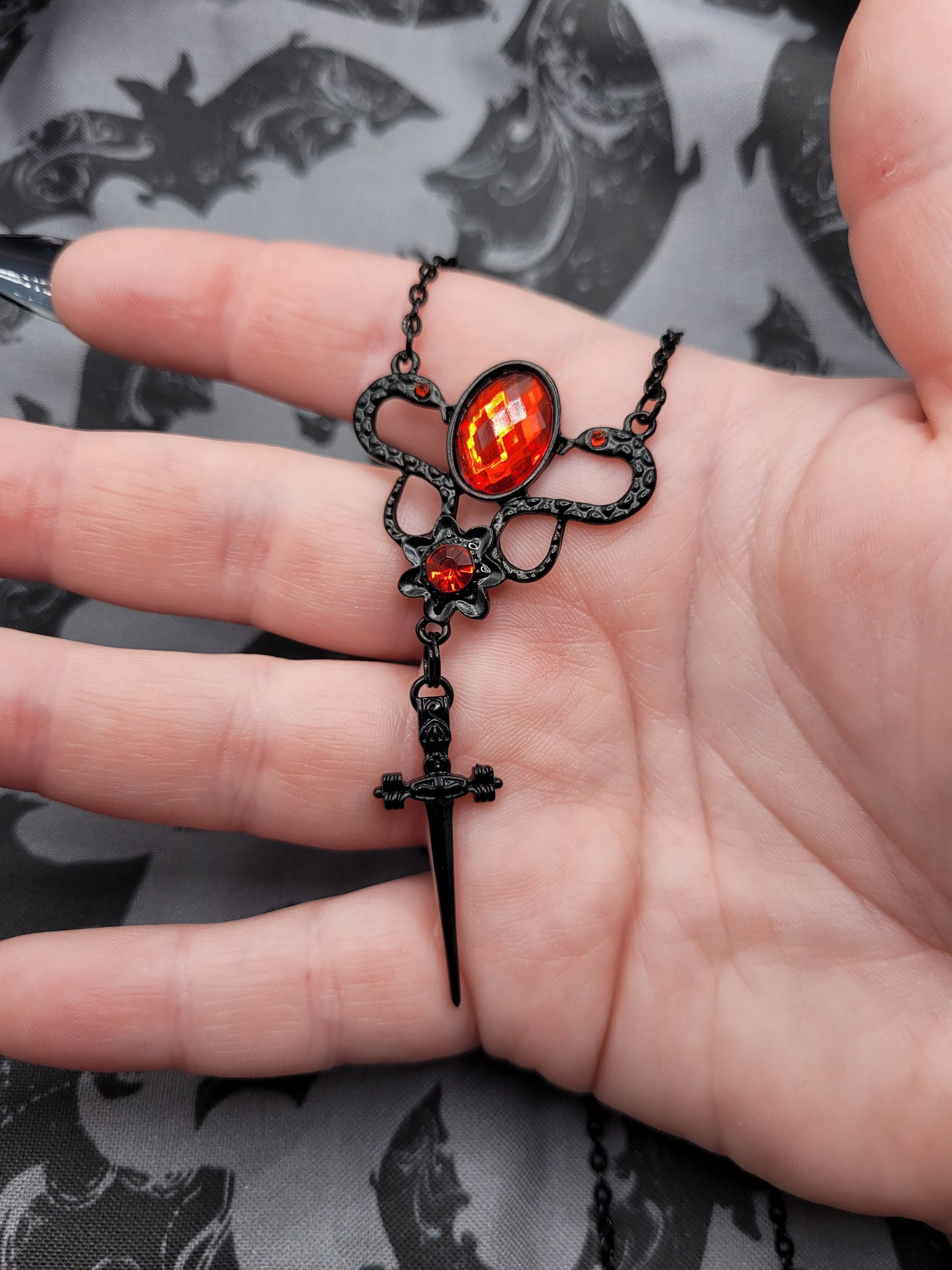 This serpentine pendant with glistening red eyes and a faceted red cabochon features a black dagger charm and hangs from a black chain, offering the perfect accent for any goth outfit.