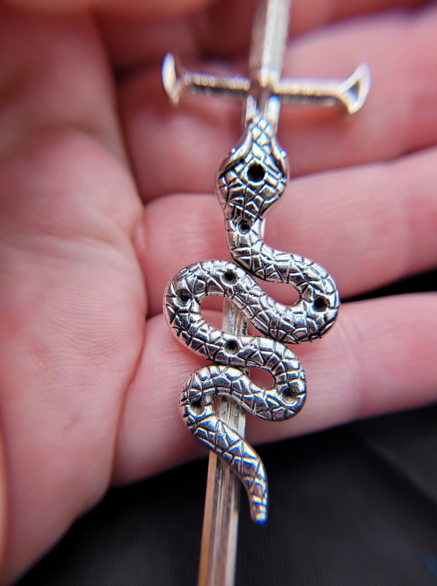 A bit dangerous, this serpentine silver sword goes beautifully with any fantasy or occult look.