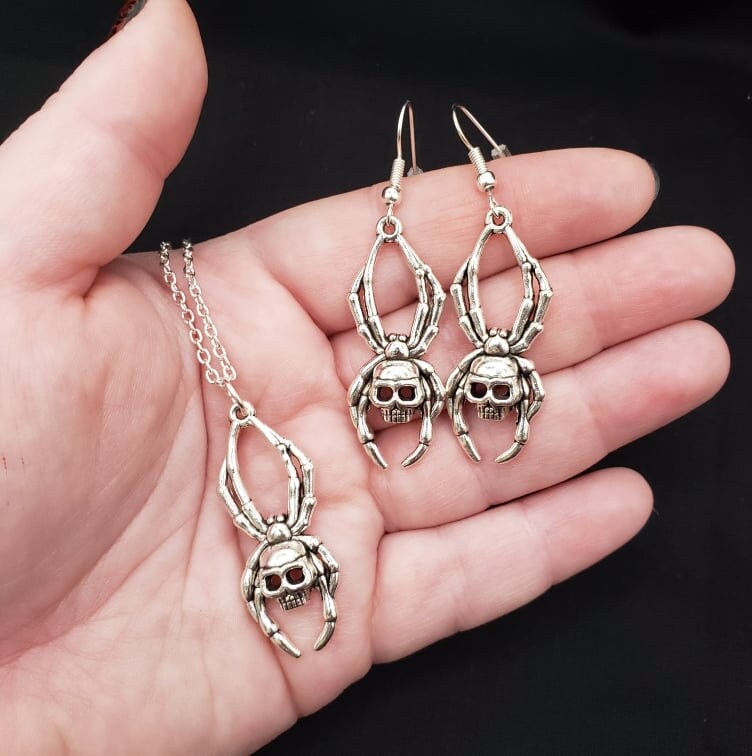 Spooky Goth Skull Spider Earrings and Necklace Set