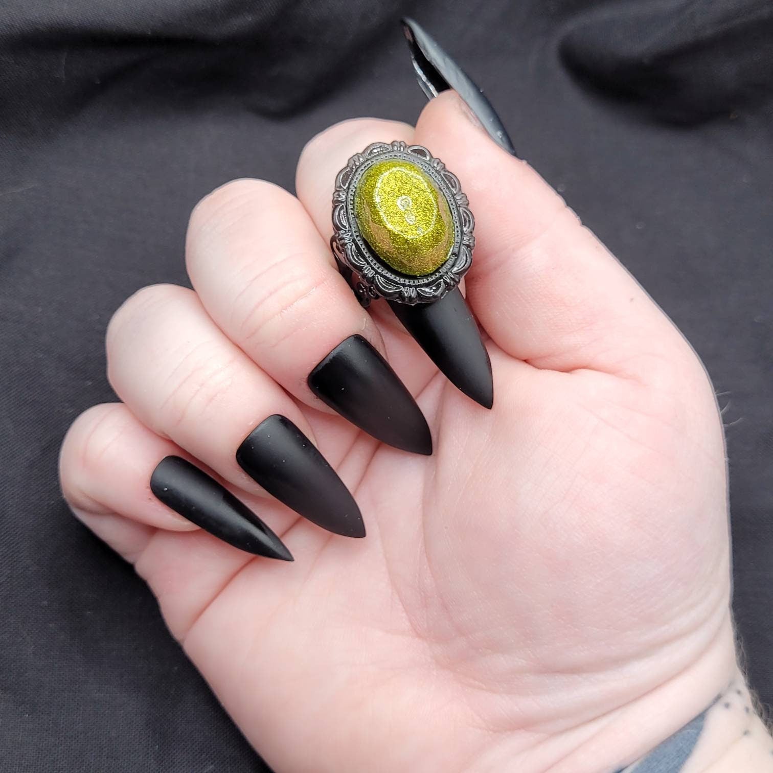 A bit of green sparkle makes this adjustable ring a nice accent for any goth outfit! The yellow-green color is a mesmerizing echo of a cat's eye.